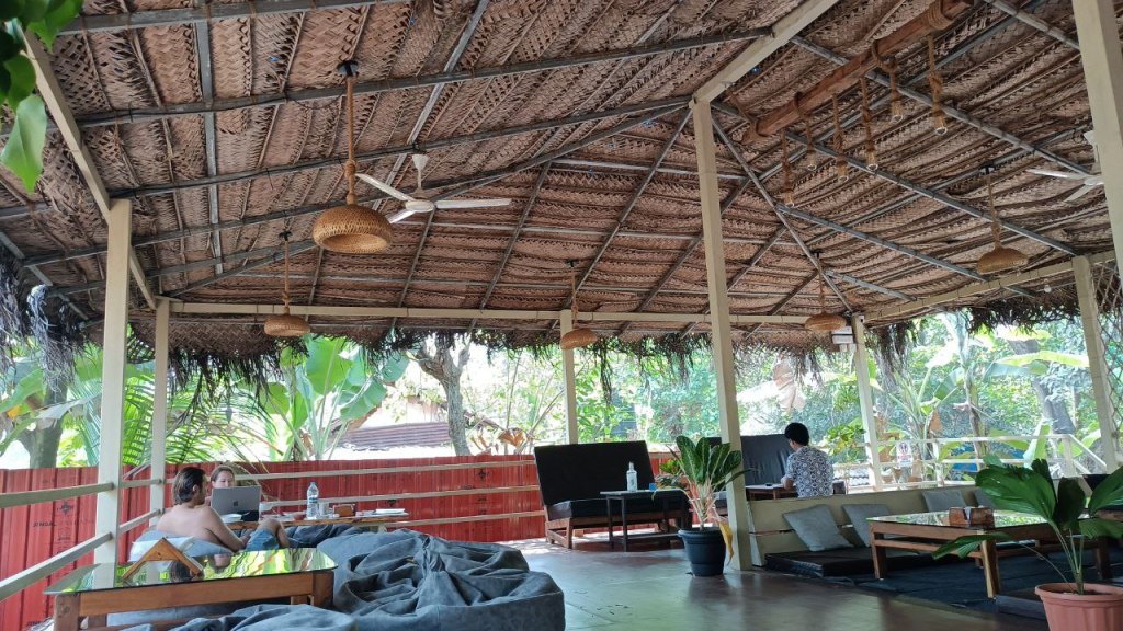 In der Luft liegt der süße Duft der Cashewblüte und die Natur protzt mit ihrer grünen Pracht. Ich schmelze in einen Sitzsack in einem durchgestylten Restaurant im lässigem Hippychick. Der Sitar-Ambient-Groove wird über das laue Lüftchen zu mir unter das Palmwedeldach getragen. Wir sind nur zu viert in dieser Oase des Friedens, die auch in Ubud sein könnte. Es ist herrlich hier im Lost Monky und lädt zum Verweilen ein. Lost fühle ich mich hier nicht im geringsten, eher in Arambol angekommen. Ich trinke ausgezeichneten Siebträger-Cappuccino und schaue Streifenhörnchen zu, wie sie duch die Bäume klettern. Dieses für Yogis weichgespühlte Indien chillt mich enorm und ist genau der Ausgleich, den ich zu meinen abendteuerlichen Vormittag jetzt brauche.