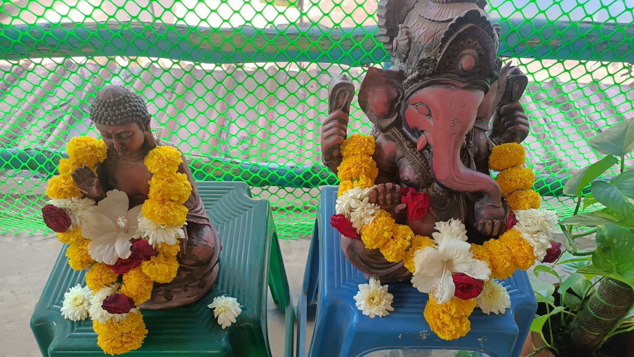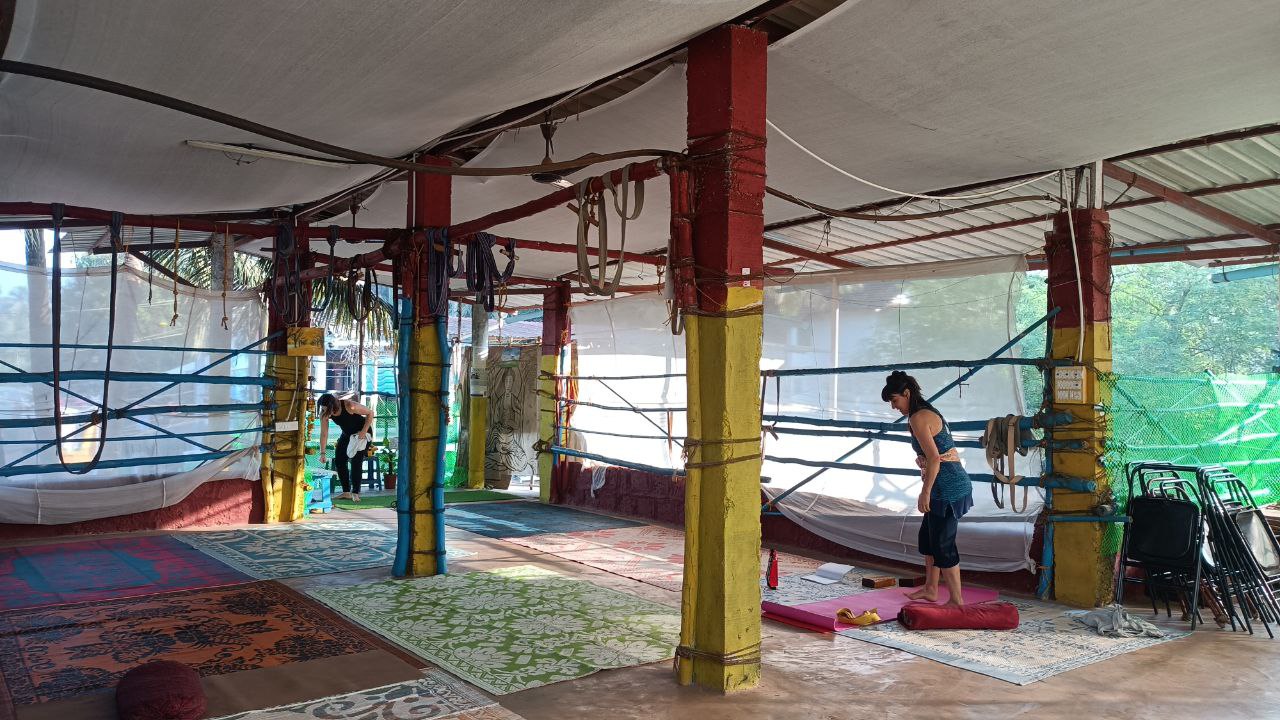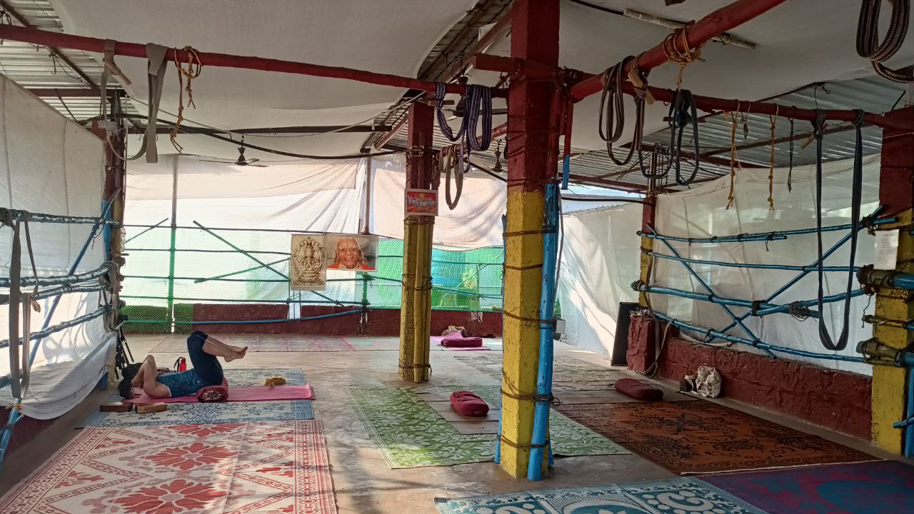 Danach folgte die erste Iyengar Stunde beim Studiobesitzer Alpesh. Wie die meisten Yogaunternehmer bietet er ein halbes Jahr Ausbildungen in den kühlen Bergen Dharamsalas an und wenn es dort zu kalt ist, residiert er in Goa, welches Yoga unter Palmen bietet. Die Asana Praxis findet im ersten Stock statt, dessen Wände offen sind. Ein paar Tücher und Bambusstangen begrenzen die Seiten und es ist luftig und angenehm dort.