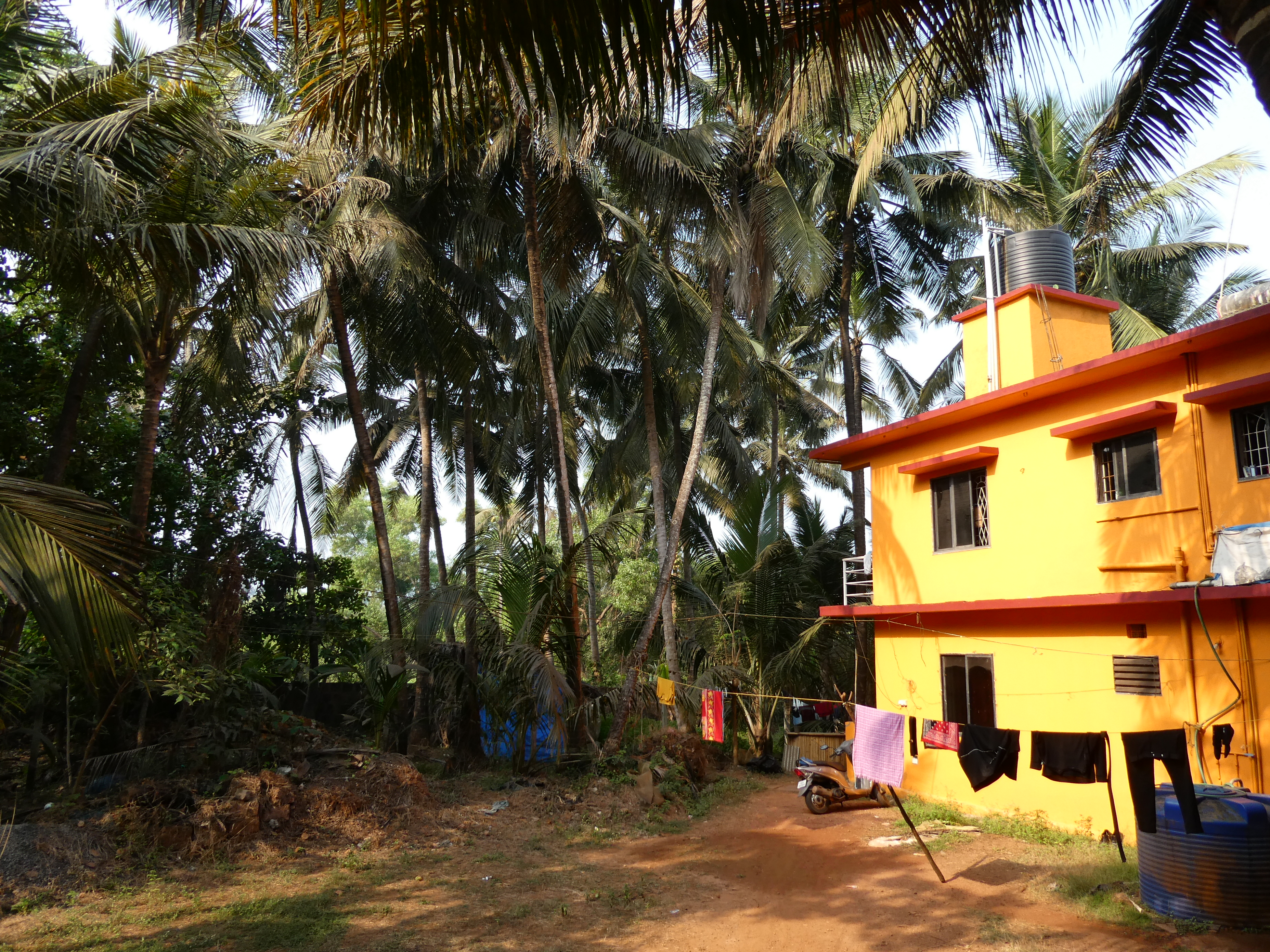 Überall liegen schläfrige Hunde auf dem Boden, die wünschten, sie hätten noch weniger Fell oder zumindest keine Flöhe mehr. Wenn Autos herannahen, mobilisieren sie ungeahnte Kräfte und machten ordentlich Krach. Ich habe die Straßenhunde als sehr friedlich wahrgenommen. Seit ich vernommen habe, dass Straßenhunde in Indien nun als ein Problem eingestuft wurden, da sie Kinder getötet und ältere Menschen angegriffen haben, sind mir unsere Begegnungen nicht mehr ganz so geheuer. Bei meinen Spaziergängen ignoriere ich sie geflissentlich und dann passiert auch nichts. Roller lassen die Hundegangs zumeist problemlos passieren, was gut ist, denn ich habe mir Freitag einen Roller gemietet. Promt habe ich ihn beim ersten Einparken mit Vollgas in einem Gebüsch versenkt. Ich starte geschockt ins Dickicht und stammelte „i destroyed the scooter“. Die Hotelangestellten haben mich hingesetzt, mir Wasser gebracht, meinen Roller rausgefischt und geparkt. Ein imposanter Auftritt. Im Hotel weiß man nun Bescheid. Da ist sie wieder, die Deutsche, die nicht Roller fahren kann. Ist der Ruf erst einmal ruiniert, lässt sich ungeniert nach Hilfe fürs Einparken fragen, oder die Retter in der Not Benzin aus PET-Flaschen in den Tank füllen lassen. Bei meiner Wanderung am Samstag durch das friedliche Mandrem, habe ich bei jedem Tempel oder Kirche um Beistand gebeten für eine sichere Reise auf Indiens Straßen. Ich dachte viel hilft viel. Hat auch geklappt, denn ich bin sicher (im Schneckentempo) zum Yoga gefahren nach Arambol am Samstag. Äußerlich easy Rider, innerlich 110 Puls. Rückfahrt in der Rush Hour war dann wieder so, dass ich mich langsam entspannen konnte. Nichtsdetotrotz werde ich meinen Roller am Montag nach meinem nächsten Umzug wieder zurück geben. Vielleicht gibt es ja noch Ärger wegen der Reperatur und der Vermieter hat meinen Pass als Pfand. Das möchte ich nun nicht auf den letzten Drücker vor dem Rückflug regeln. Mittlerweile denke ich mir, dass ist nichts, was sich nicht mit Geld regeln lässt. Also Schwamm drüber, hab mir ja nicht ernsthaft weh getan.